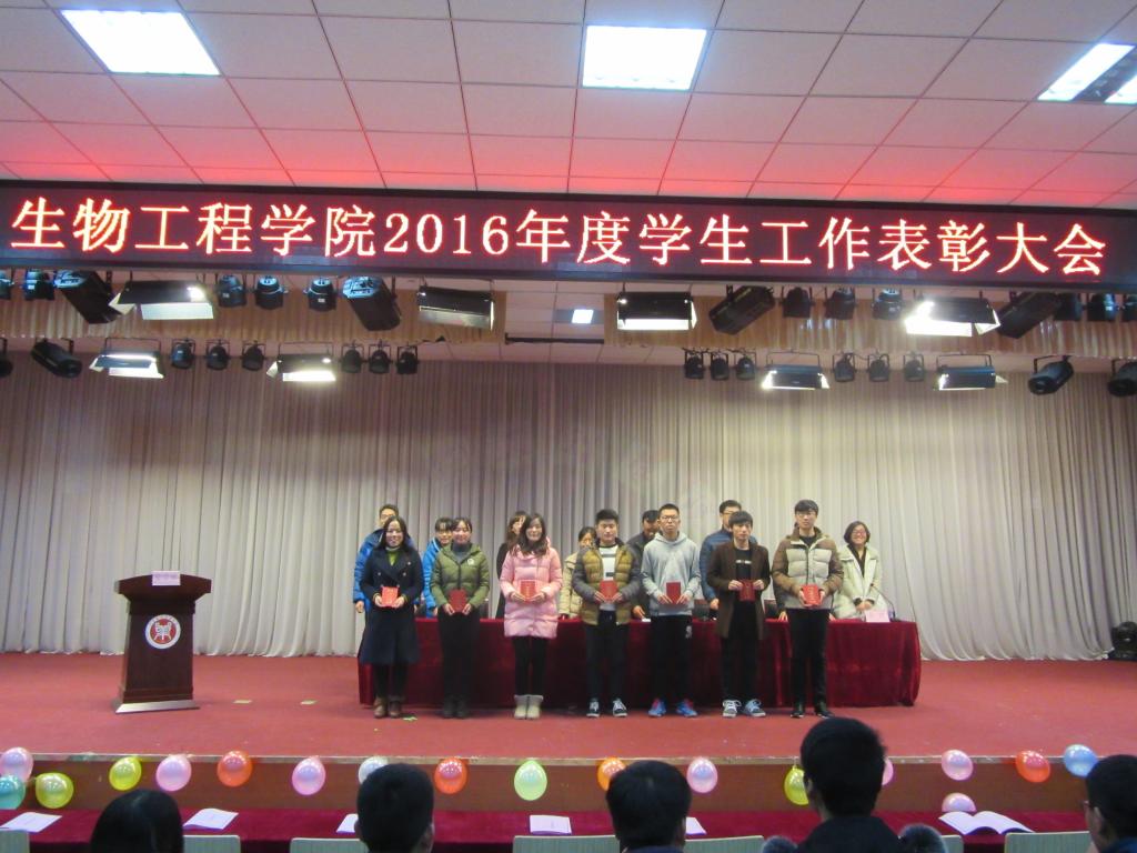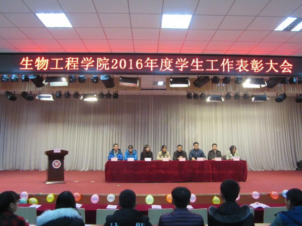 2016年12月28日,生物工程学院在大学生活动中心举办2016年度学生工作表彰大会暨迎新年元旦联欢会。会议由生物工程学院团总支书记张粟老师主持,院党总支书记王建伟老师、院长王永芬老师、院党总支副书记杨军老师、副院长潘春梅老师、教学秘书王静老师、党政综合办公室主任郭宏伟老师、科研秘书郑鸣老师及我院全体教职工、学生参加此次会议。