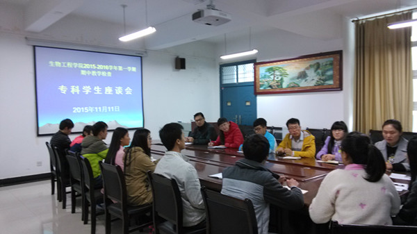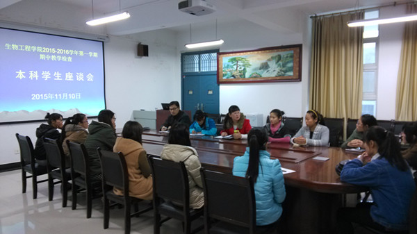 按照我院2015-2016学年第一学期期中教学检查活动安排意见,2015年11月10日和11日中午生物工程学院在系会议室分别对本科生和专科生召开了学生座谈会。教学院长王永芬、副主任潘春梅、副书记杨军、教学秘书王静与学生代表进行座谈,广泛听取学生对学校工作特别是在教学、学生管理、日常生活等方面的意见建议,倾听广大学子心声。