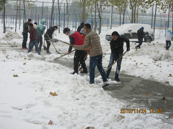 11月23日傍晚郑州市迎来了2015年的第一场雪,24日中午我院志愿者们牺牲自己的休息时间开展了清扫全校区积雪的活动。龙子湖校区的每条道路上都有我院志愿者们奋力清雪的身影。大家不畏严寒,不怕困难,拿起铁锹,铲除厚重的冰雪,经过大家的共同努力,道路上的积雪被清除完毕。给大家提供方便,为全校师生送去了温暖。