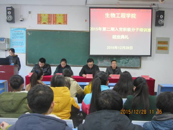 为了加强党员队伍建设,进一步提高入党积极分子对党的认识,生物工程学院于12月2日—12月28日,成功举办了2015年第二期入党积极分子培训班。39名入党积极分子参加了此次培训,39人顺利结业。